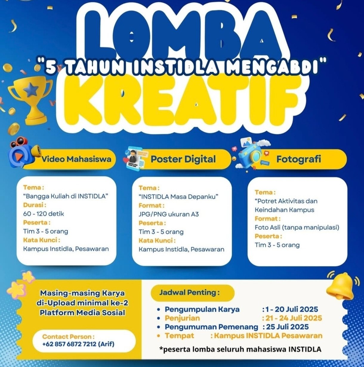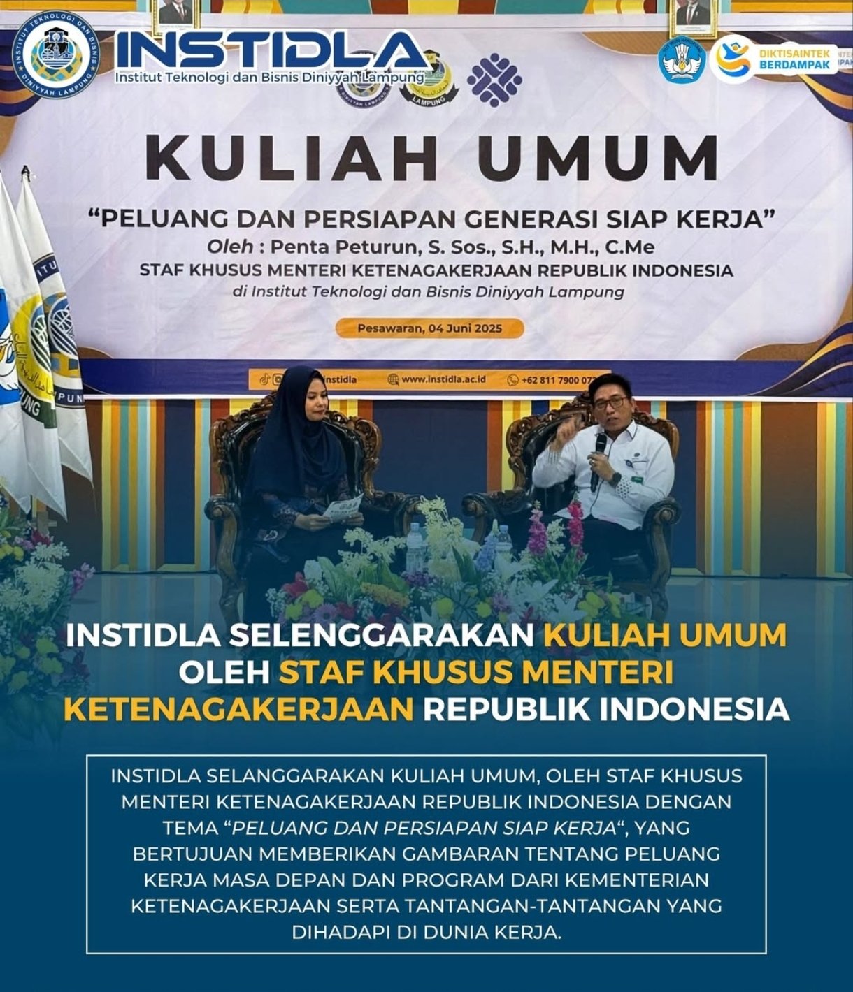 Assalamu'alaikum warahmatullahi wabarakatuh, Salam sejahtera bagi kita semua. Dengan rasa syukur yang mendalam, saya ucapkan selamat datang kepada seluruh mahasiswa baru di INSTIDLA. Kami sangat bangga menyambut Anda sebagai bagian dari keluarga besar kami. Sebagai institusi yang berfokus pada pengembangan sumber daya manusia di bidang teknologi informasi dan manajemen, kami berkomitmen untuk memberikan pendidikan terbaik yang dapat mempersiapkan Anda menghadapi tantangan dunia kerja yang semakin kompetitif. Di INSTIDLA, Anda akan mendapatkan pengalaman belajar yang komprehensif dengan dukungan pengajar profesional dan fasilitas yang terus kami kembangkan. Kami percaya, pendidikan yang kami berikan tidak hanya akan membekali Anda dengan ilmu pengetahuan, tetapi juga membentuk karakter yang kuat untuk mencapai kesuksesan yang bermakna. Saya mengajak Anda untuk memanfaatkan setiap kesempatan yang ada, baik dalam kegiatan akademik maupun non-akademik, untuk mengembangkan potensi terbaik Anda. Bersama-sama, kita akan mewujudkan impian dan membangun masa depan yang gemilang. Selamat bergabung di INSTIDLA. Semoga perjalanan Anda di sini penuh dengan prestasi dan keberkahan.